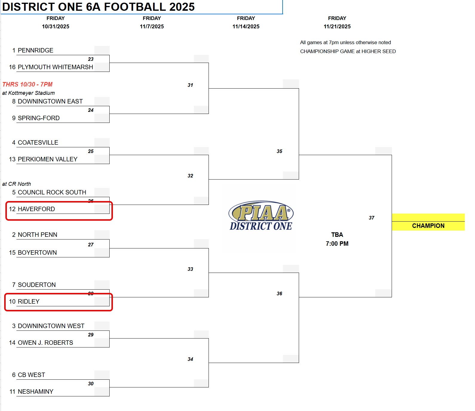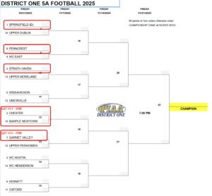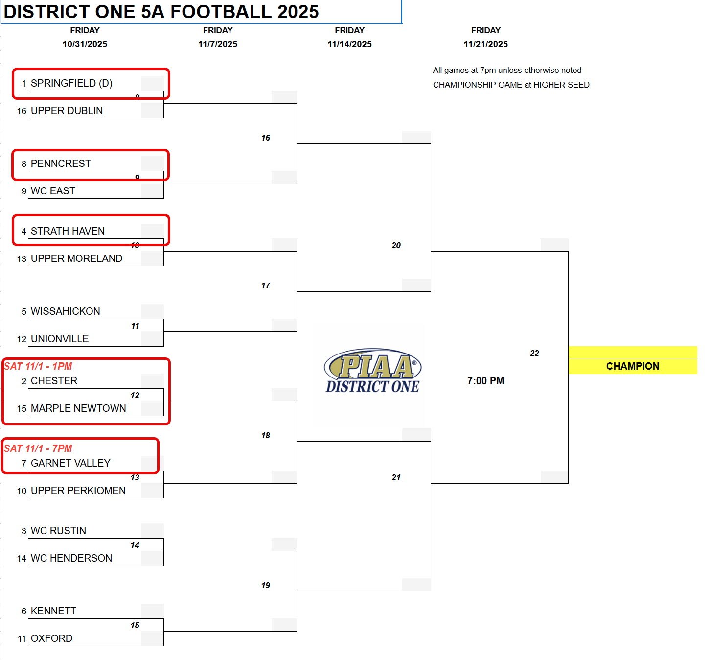 District 1 football classifications are divided into 6 classifications based on student population. Strath Haven and most of the Central League are in in the 5A classification while the remainder are in 6A.