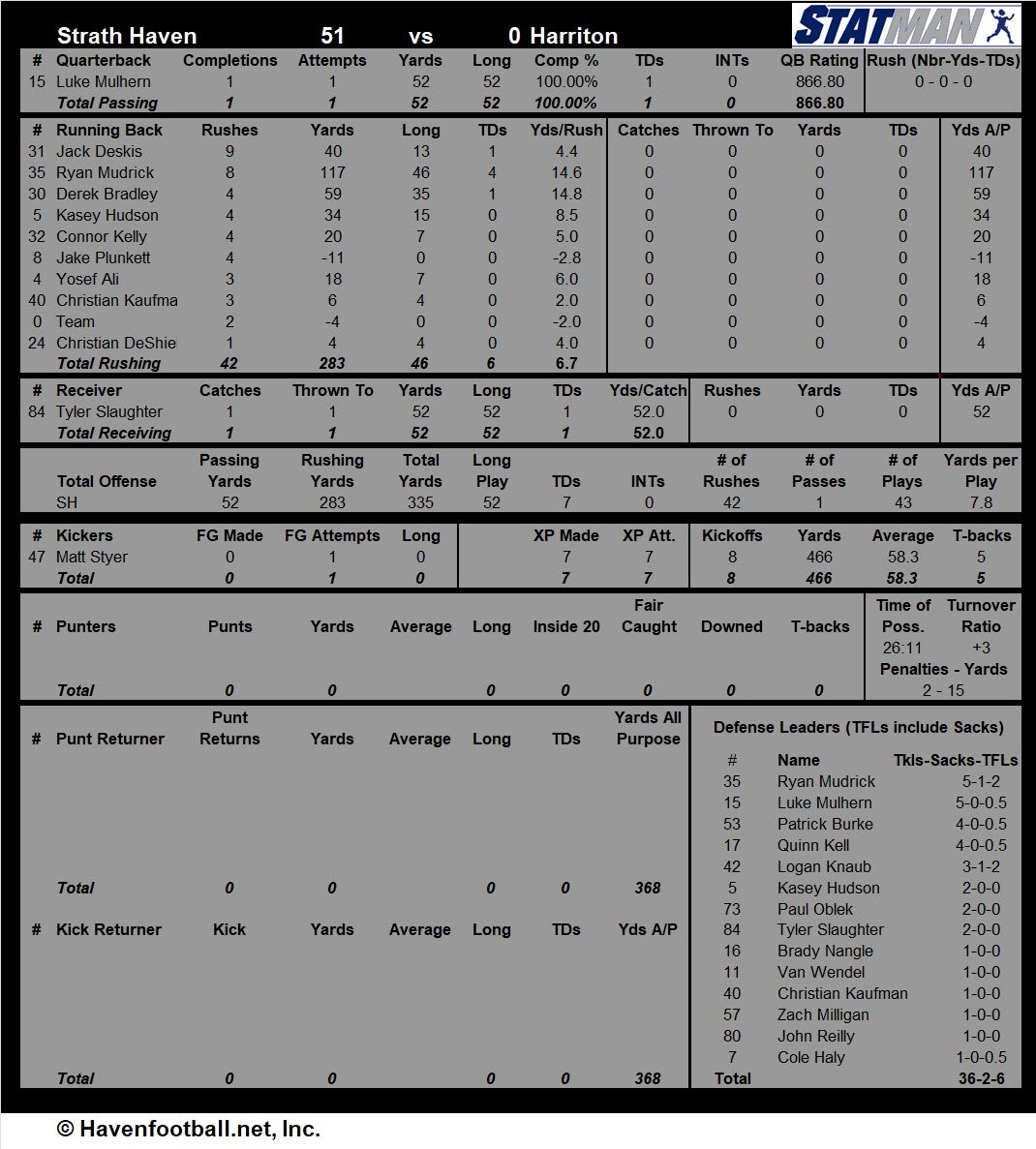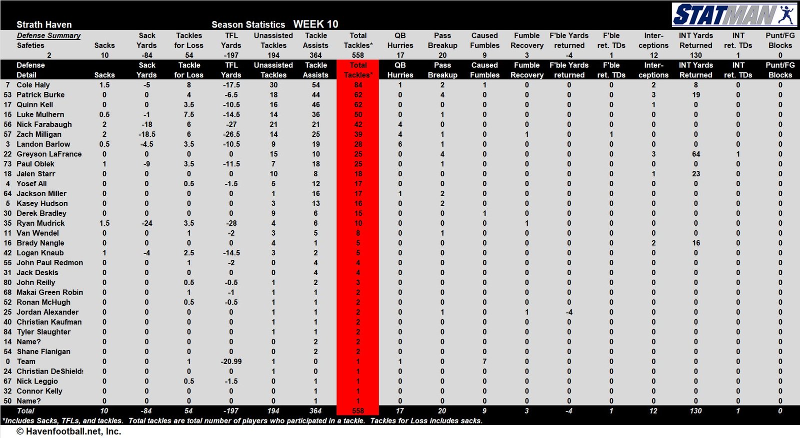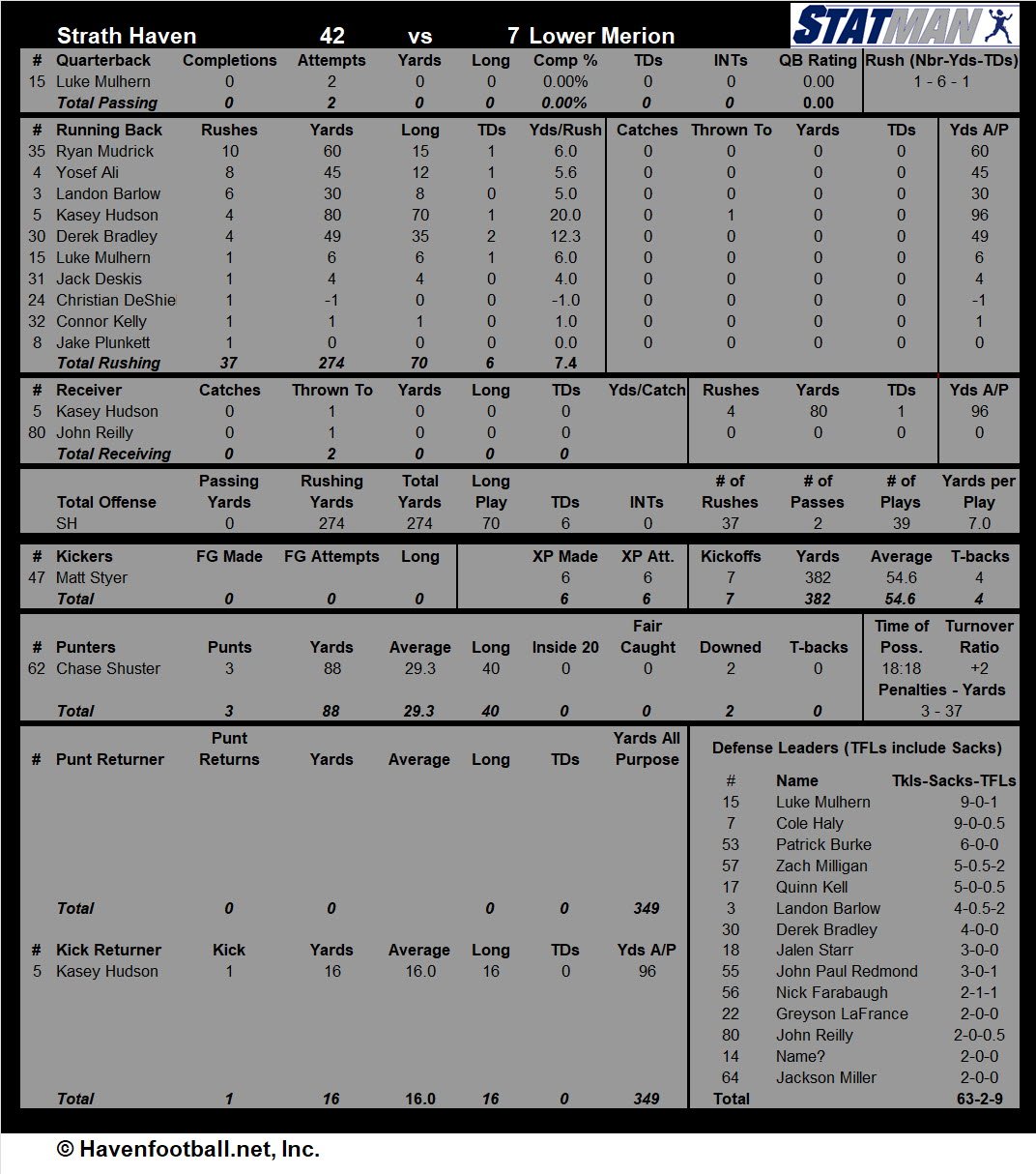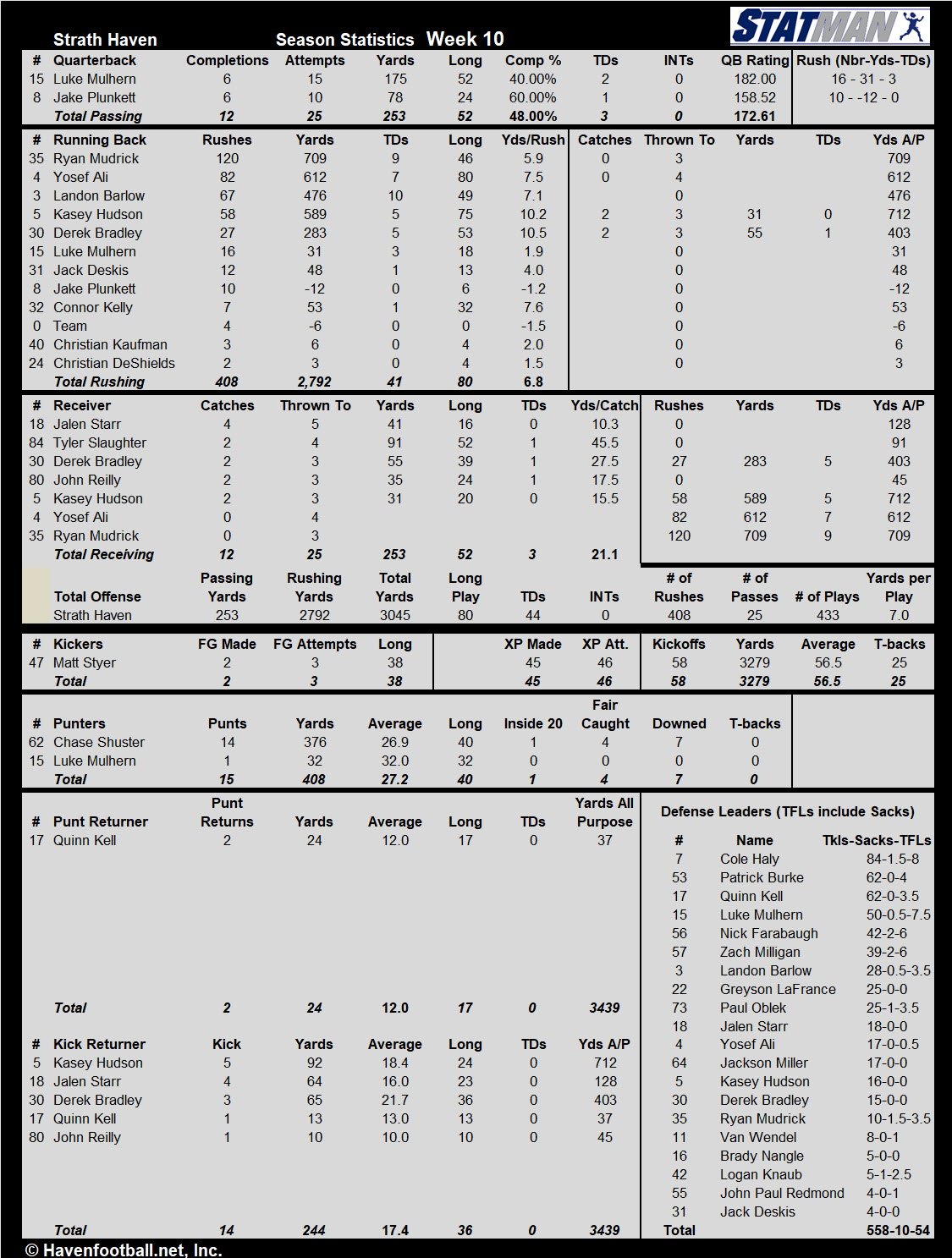 These statistics are taken in the press booth at each game. Andrew reviews the official game film before we publish our stats each week. We do our best to capture every yard and every player involved. We use the NCAA guidelines for our statistics. Please note that our program allows for only two defensive tacklers per play. If you see an error please feel free to drop us a line at havenstatguys@aol.com.