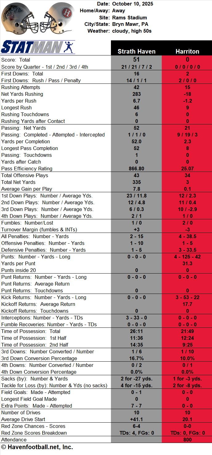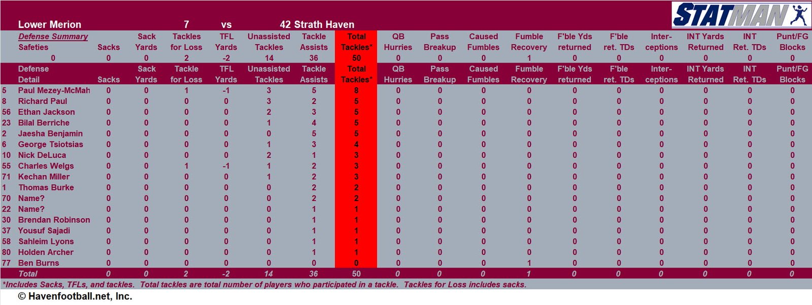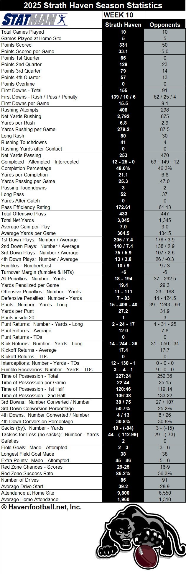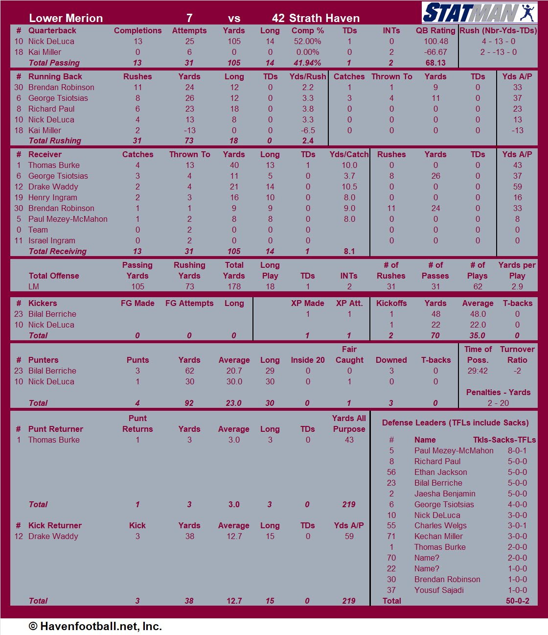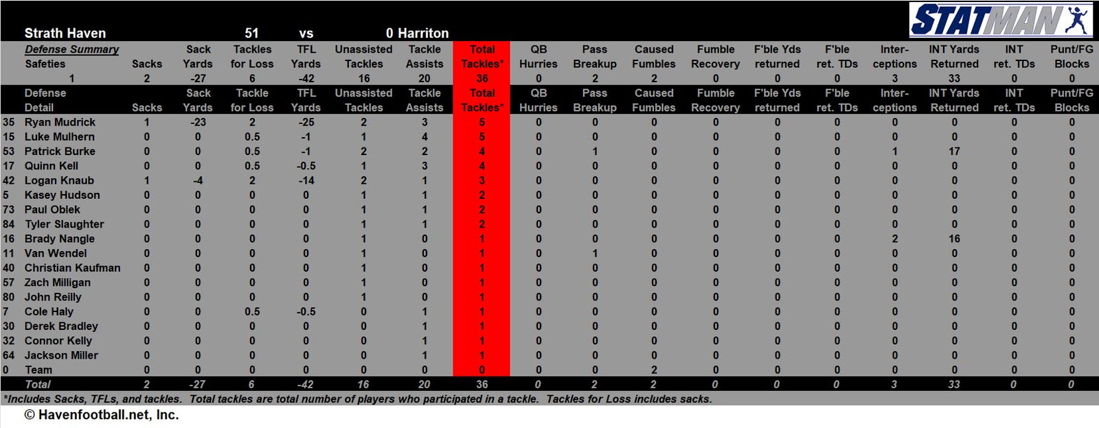 These statistics are taken in the press booth at each game. Andrew reviews the official game film before we publish our stats each week. We do our best to capture every yard and every player involved. We use the NCAA guidelines for our statistics. Please note that our program allows for only two defensive tacklers per play. If you see an error please feel free to drop us a line at havenstatguys@aol.com.