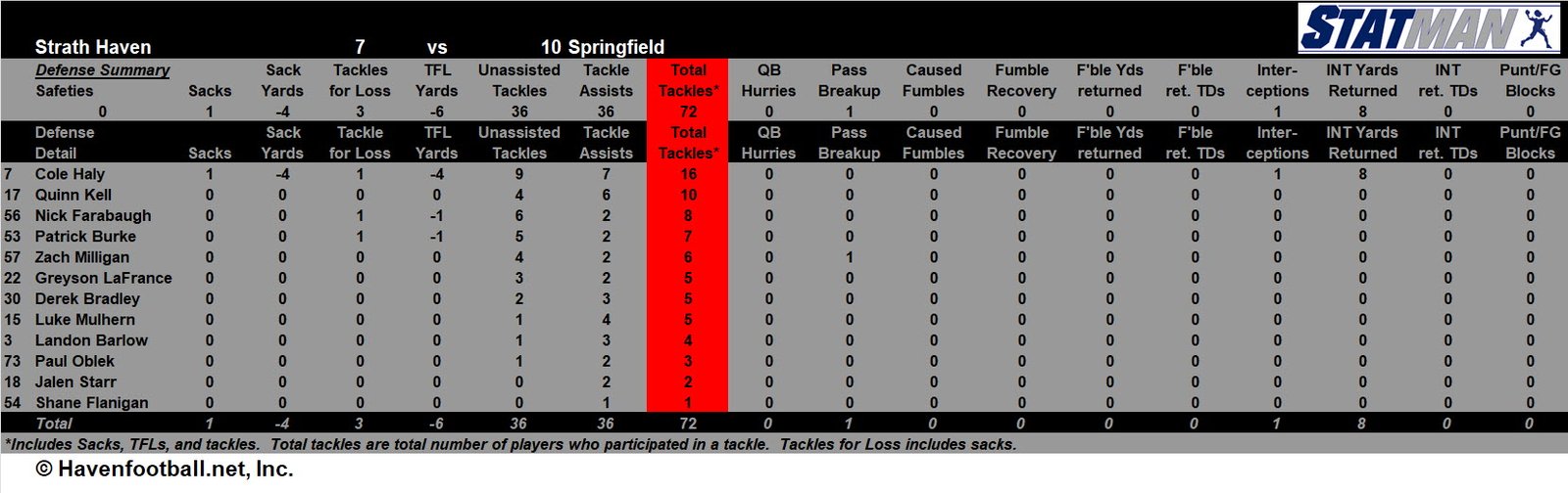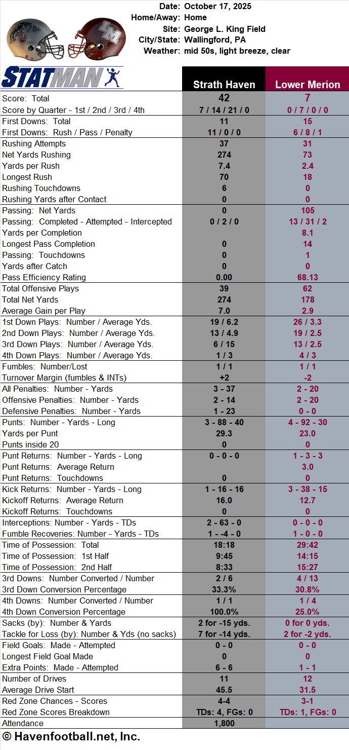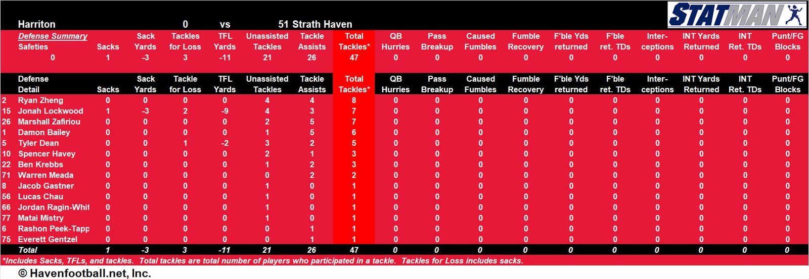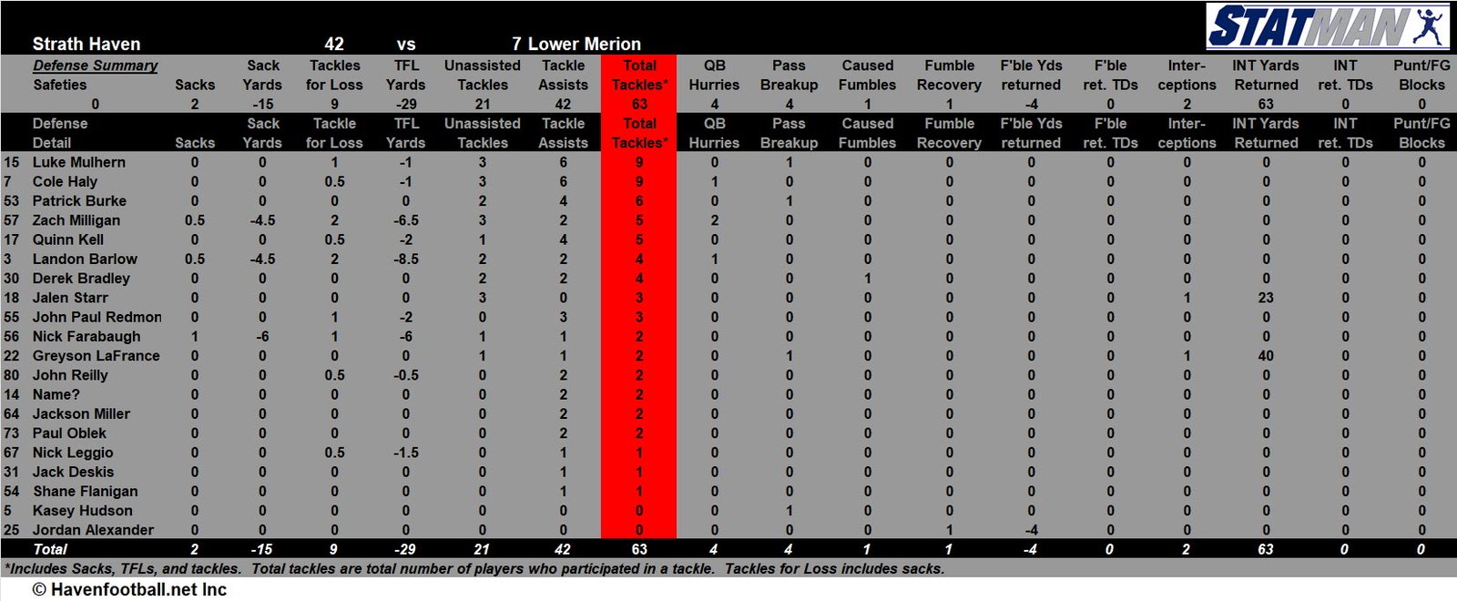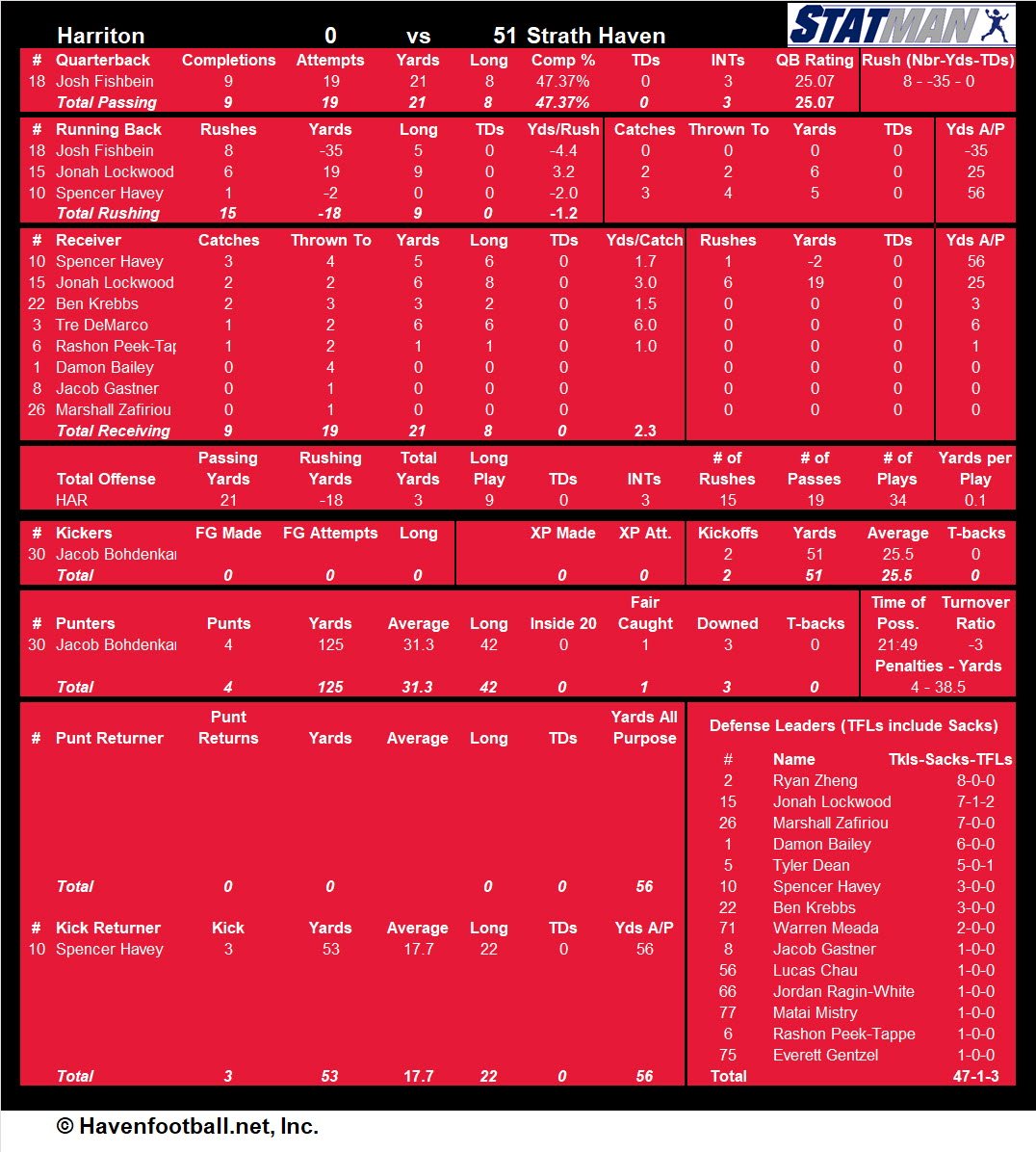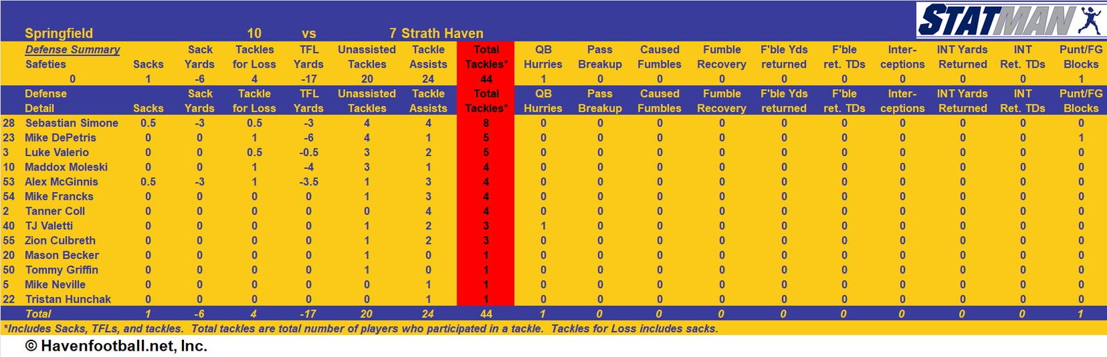 These statistics are taken in the press booth at each game. Andrew reviews the official game film before we publish our stats each week. We do our best to capture every yard and every player involved. We use the NCAA guidelines for our statistics. Please note that our program allows for only two defensive tacklers per play. If you see an error please feel free to drop us a line at havenstatguys@aol.com.