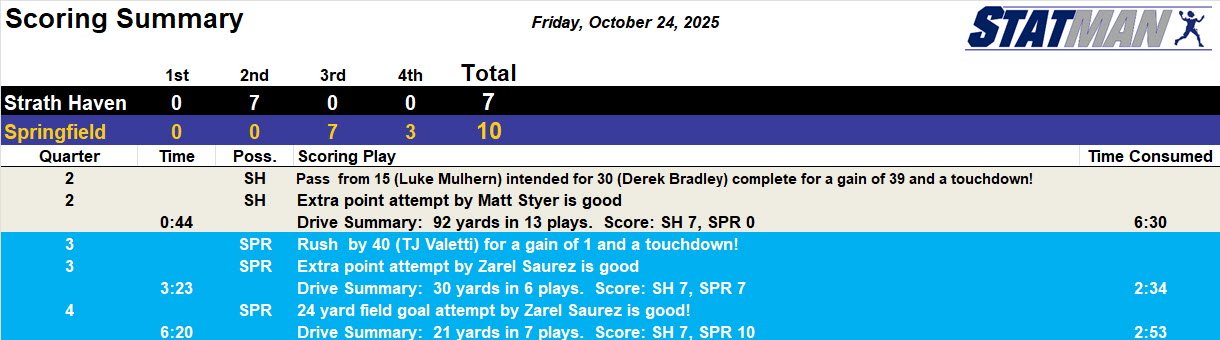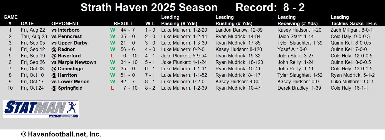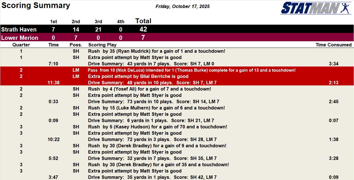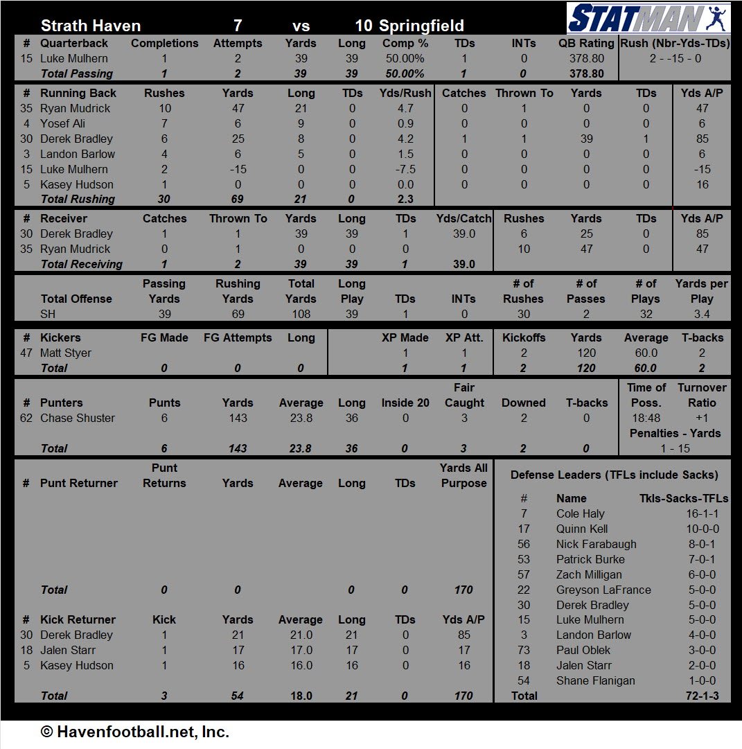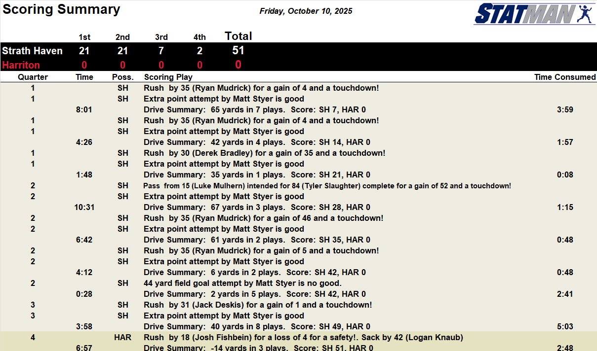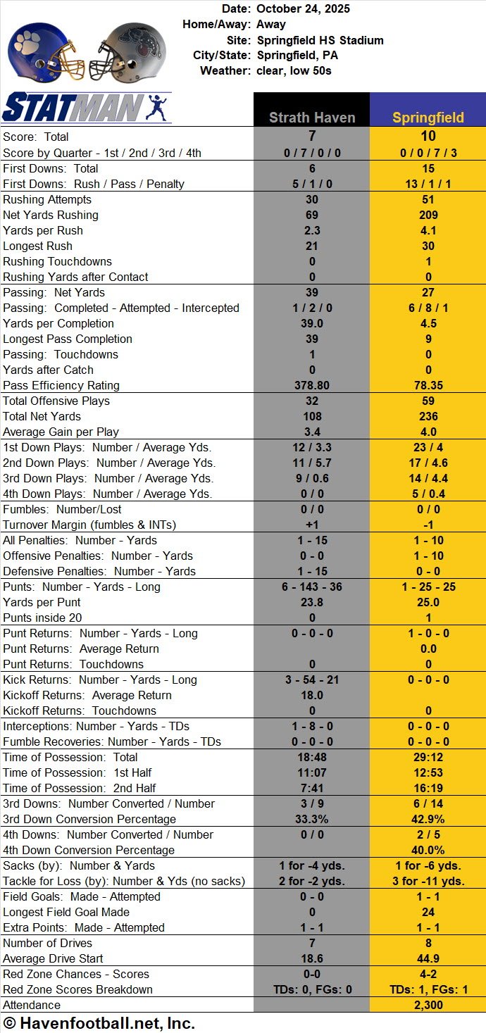 These statistics are taken in the press booth at each game. Andrew reviews the official game film before we publish our stats each week. We do our best to capture every yard and every player involved. We use the NCAA guidelines for our statistics. Please note that our program allows for only two defensive tacklers per play. If you see an error please feel free to drop us a line at havenstatguys@aol.com.